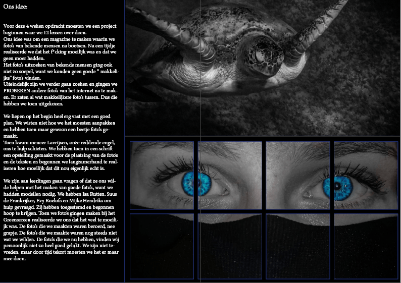 In de afgelopen weken zijn we bezig geweest met het maken van een magazine. De eerste week ben ik bezig geweest met een plan maken samen met Lianne, de week daarna kwam Zaïna erbij en heeft met ons het magazine meer vorm gegeven. Na twee weken of foto’s maken waren we eigenlijk nog steeds niet tevreden over de foto’s die we hadden. Meneer Lavrijsen zei dat we maar gewoon verder moesten met de foto’s die we hadden, dus dat hebben we gedaan.