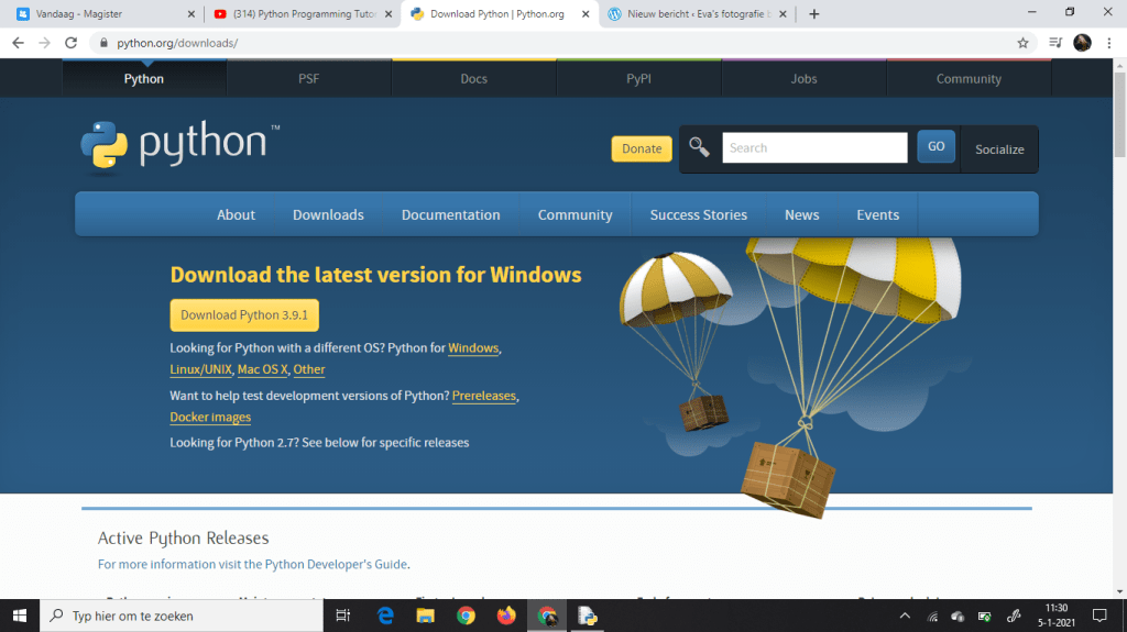 - Het eerste filmpje dat we hebben gekeken ging over hoe dat je Python moet downloaden. Het was best wel simpel. Je ging naar http://www.python.org, dan ga je naar downloads en klik je op de grote gele knop.
